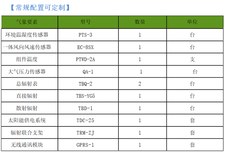 這套系統可觀測的環境輻射要素有:環境溫度、環境濕度、組件溫度、風速、風向、氣壓、太陽總輻射、日照時數、太陽總輻射、太陽直接輻射、太陽散射輻射等指標。具有性能穩定,檢測精度高,完全無人值守等特點,可滿足專業光伏電站環境氣象監測、太陽輻射監測等相關要求。