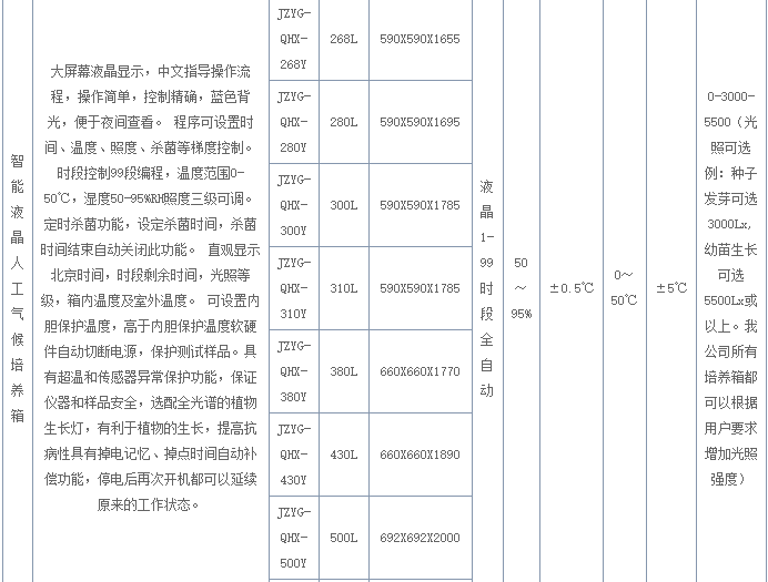 智能人工氣候培養箱(種子發芽箱,智能人工氣候培養箱)每種型號后面的B代表晝夜兩個溫度、時間段;D代表1-30個溫度、時間、光照段,自由組合實驗周期顯示,光照級別顯示。例:JZYG-QHX-268B為晝夜2個時間段;JZYG-QHX-268D為1-8個多時間段多段設置其中:溫度、濕度、光照、時間均可多段設置。