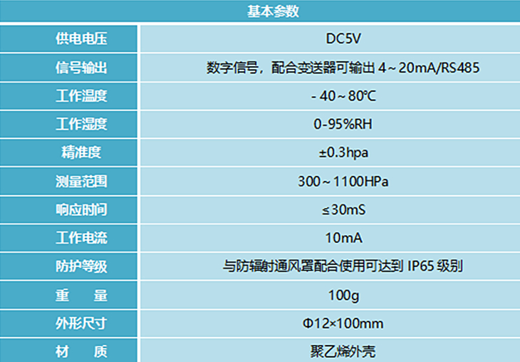 QA-1型氣壓傳感器是專業測量大氣壓力的傳感器。內部選用高精度的元件,并設有防浪涌和極性反相保護。外形美觀、小巧,安裝方便,節省空間。氣壓傳感器要求安放在專用防輻射通風罩內,工作環境相對穩定,且與外界大氣通道暢通,此傳感器可與多種數據采集器或變送器配合使用,精準測量大氣壓力數據,廣泛于氣象、環保、農業、光伏、電力、交通等行業。