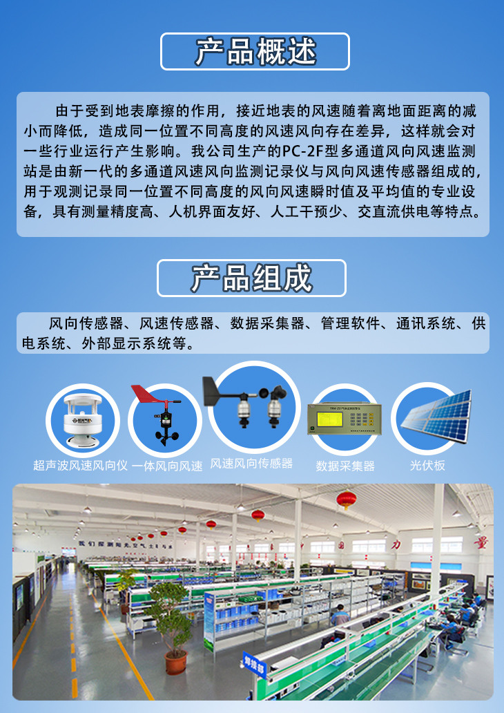 由于受到地表摩擦的作用,接近地表的風(fēng)速隨著離地面距離的減小而降低,造成同一位置不同高度的風(fēng)速風(fēng)向存在差異,這樣就會(huì)對(duì)一些行業(yè)運(yùn)行產(chǎn)生影響。我公司生產(chǎn)的PC-2F型多通道風(fēng)向風(fēng)速監(jiān)測(cè)站是由新一代的多通道風(fēng)速風(fēng)向監(jiān)測(cè)記錄儀與風(fēng)向風(fēng)速傳感器組成的,用于觀(guān)測(cè)記錄同一位置不同高度的風(fēng)向風(fēng)速瞬時(shí)值及平均值的專(zhuān)業(yè)設(shè)備,具有測(cè)量精度高、人機(jī)界面友好、人工干預(yù)少、交直流供電等特點(diǎn)。