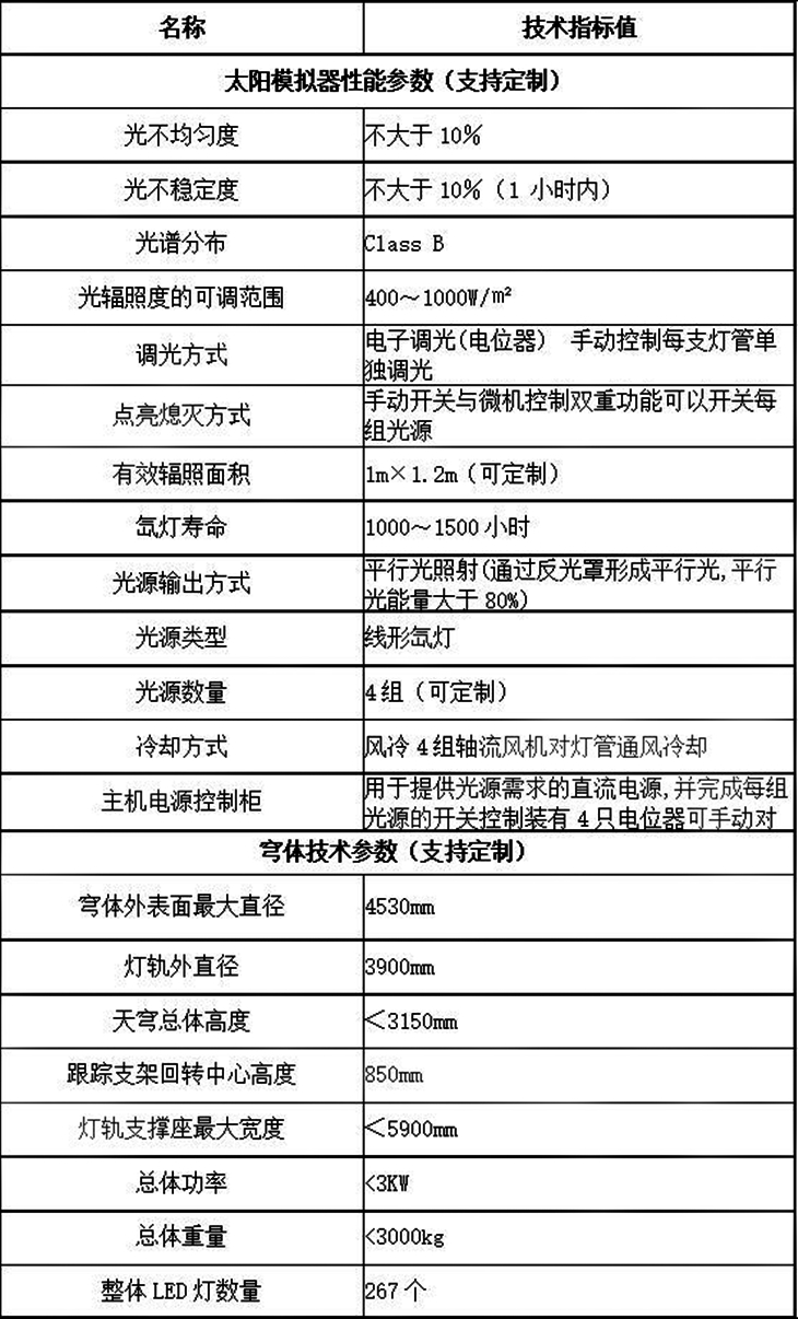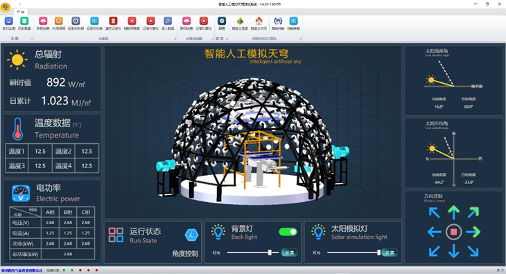 近年來隨著太陽能應用的不斷發展,關于太陽能利用、轉換的相關產品,尤其是太陽能電池板的使用量也逐漸增加。過去,這些產品都是在自然環境下進行測試,受制于氣候條件,因此存在測試周期長、數據的可重現性差等不足。JZYG-TGS1智能人工模擬天穹是模擬天空及太陽運行的一種光源設備,可以在高精度擬合太陽光譜分布的前提下,實現不同的太陽輻照度、光照角度等條件,滿足測試研究對太陽輻照的特殊需求。使用智能人工模擬天穹能夠克服氣候多變性所造成的不便,可以全年24小時在室內對太陽能產品進行測試。