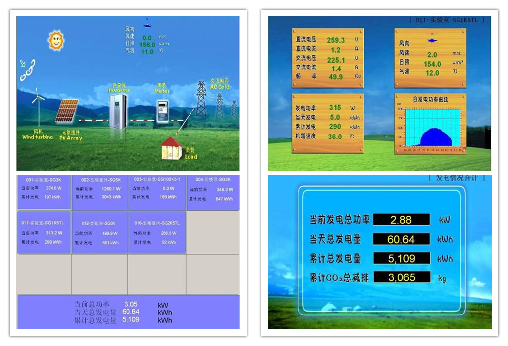 實時顯示電站的當前發電總功率、日總發電量、累計總發電量、累計CO2總減排量以及每天發電功率曲線圖。