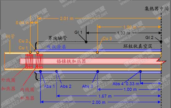 罩玻璃管(Gl)銅管(Cu)和內(nèi)管(Abs)熱偶計(jì)在高溫管的位置(另一半沒有標(biāo)出)銅管和罩玻璃管表面的熱電偶固定方法:用金屬絲把熱偶計(jì)纏繞在表面。