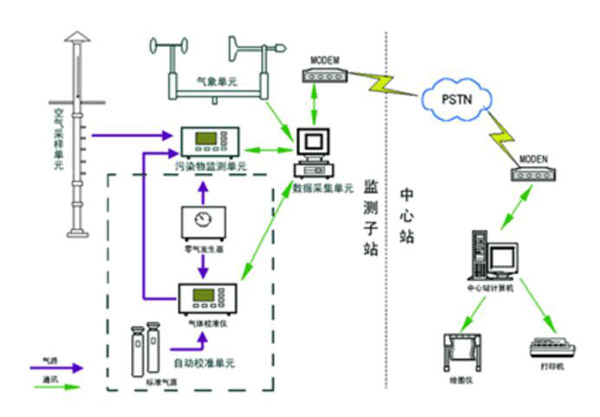 現(xiàn)場校準系統(tǒng):包括多種標準氣體可連續(xù)自動采集大氣污染監(jiān)測儀、氣象儀、現(xiàn)場校準的數(shù)據(jù)及狀態(tài)信息等。并進行預(yù)處理和貯存,等待中心計算機輪詢或指令。