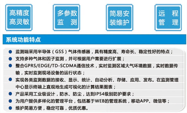 本系統具有部署快速、方便靈活等特點,實時監測實時發布監測數據,具有超標預警功能,移動端、電腦端都可實時查看和遠程監管。 為預測預警,溯源及治理等環保決策提供數據支持。