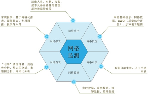 網格監測對應于水環境監測、管理的常規業務應用,主要包括各級監測網格的:網格概況、網格審核、網格數據、網格圖表、網格報表及運維質控等6個功能模塊,實現對常規性的跨界、飲用水源地、生態補償考核斷面的常規站、浮標站的全面管理、管控,并可輸出標準、規范的報表、圖表、報告等文本資料。