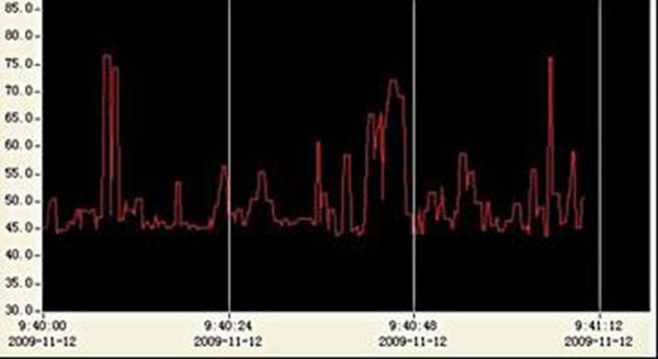 智能噪聲儀,采用數(shù)字化聲學(xué)分析測試儀為基礎(chǔ)進(jìn)行連續(xù)測量(一般持續(xù)測量24小時(shí)),每間隔1.0s自動采樣記錄,并使用計(jì)算機(jī)讀取數(shù)據(jù),繪制噪聲曲線(dB-h)。為了解城市輕軌鐵路噪聲對某小區(qū)影響的情況,,于2009年11月12日對某小區(qū)輕軌噪聲進(jìn)行了12小時(shí)連續(xù)監(jiān)測,測點(diǎn)距輕軌直線距離70米。監(jiān)測統(tǒng)計(jì)結(jié)果如下