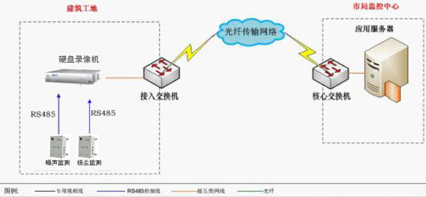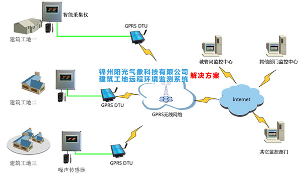 客戶需要在八個施工點實現遠程的噪聲、粉塵參數的監測預警,然后通過終端傳輸設備接入到Internet網絡。共八個施工點需要同時監測,全部接入到服務器機房,客戶端采用web網頁方式實施管理和查詢。達到實時監控與指揮的目的。