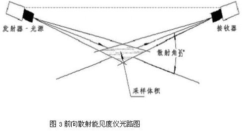 前向散射能見度儀就是根據以上機理,并選擇合適的光源(波長、光強)和光路結構,通過檢測專用光源在指定大氣體積中的前向散射強度,以求得其散射系數,進而根據相關數學模型演算出大氣能見度值。