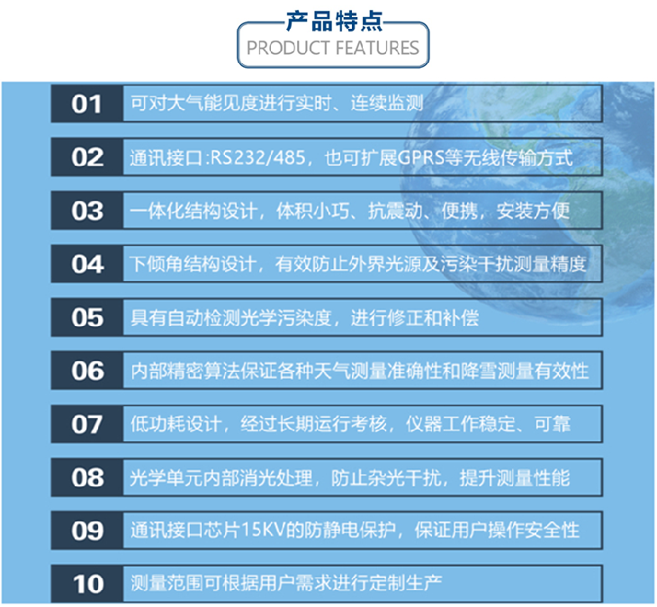 便攜式能見度儀是基于氣溶膠前向散射原理而設計的,是繼透射式檢測儀發展起來的新一代氣象能見度監測設備。它具有專業化前向散射儀器的所有性能特點,通過對采樣區懸浮顆粒發出小于90度的前向散射光的測量而實現;設備發射器、接收器一體化安裝在密封殼體內,安裝簡單,地理位置要求低,振動無影響。