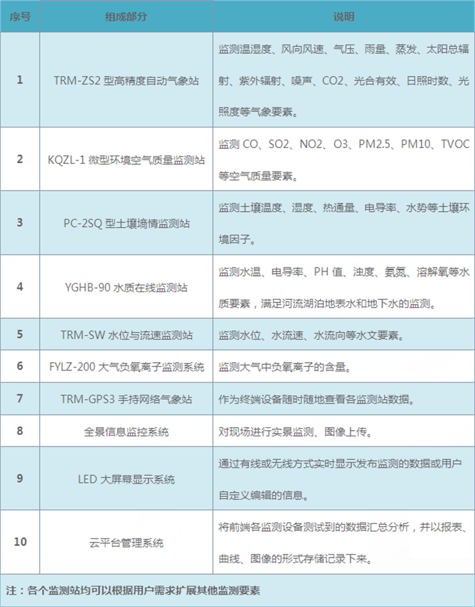 1、整個生態環境監測系統包括氣象站、水文監測站、水質監測站、土壤監測站、微型空氣質量監測站、負氧離子監測站,真正實現了生態環境的全方位監測;