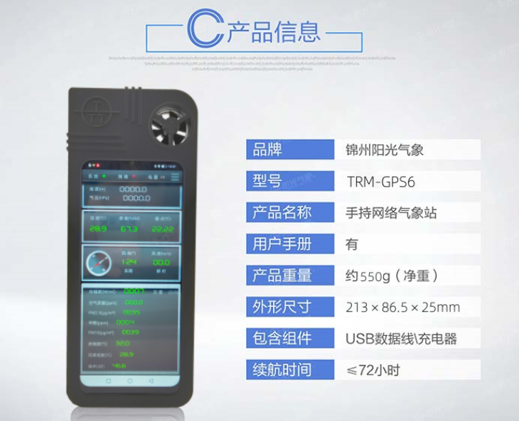 TRM-GPS6型手持氣象站是我公司研發(fā)的第四代便攜式自動氣象站。主要用于便攜條件下實施氣象觀測。它具有測量精度高、穩(wěn)定可靠、體積小、重量輕、攜帶方便、可直接手持觀測等突出優(yōu)點。系統(tǒng)能自動測量環(huán)境溫度、濕度、露點、風(fēng)速、風(fēng)向、輻射、空氣質(zhì)量、PM2.5、PM10、甲醛、大氣壓力、海拔、熱指數(shù)、風(fēng)寒指數(shù)、噪聲和當(dāng)前經(jīng)緯度等氣象要素。手持氣象站可自動儲存歷史數(shù)據(jù),內(nèi)置大容量存儲卡,可連續(xù)存儲50年數(shù)據(jù),并通過觸摸屏直接讀取,實時將數(shù)據(jù)共享到網(wǎng)絡(luò)云數(shù)據(jù)中心(陽光智慧云)。