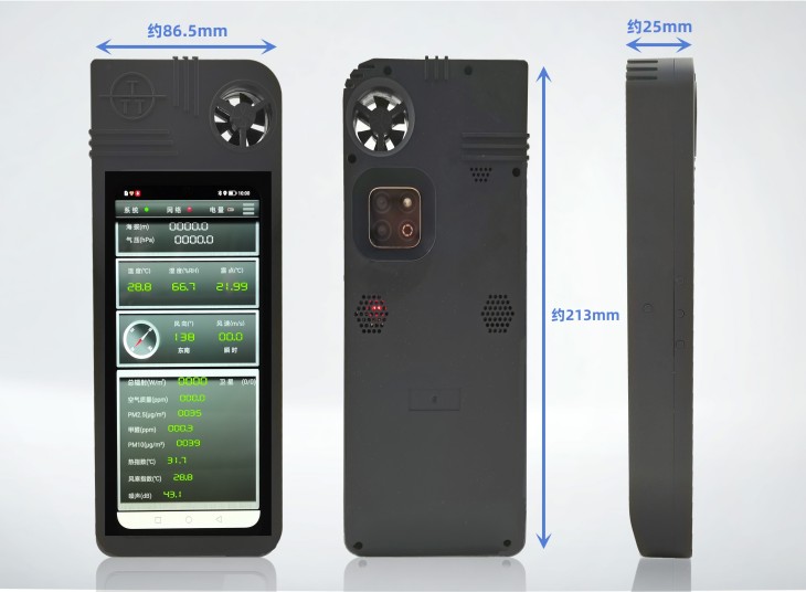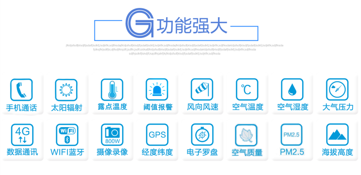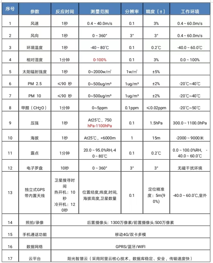 測量要素為:風(fēng)速,風(fēng)向,環(huán)境溫度,環(huán)境濕度,氣壓,太陽輻射,風(fēng)寒指數(shù),熱指數(shù),露點,海拔高度,位置經(jīng)度緯度,電子羅盤,時間,空氣質(zhì)量、PM2.5、PM10、甲醛、照拍/錄像 , 手機(jī)通話功能 , GPRS無線數(shù)據(jù)網(wǎng)絡(luò),數(shù)據(jù)云平臺。