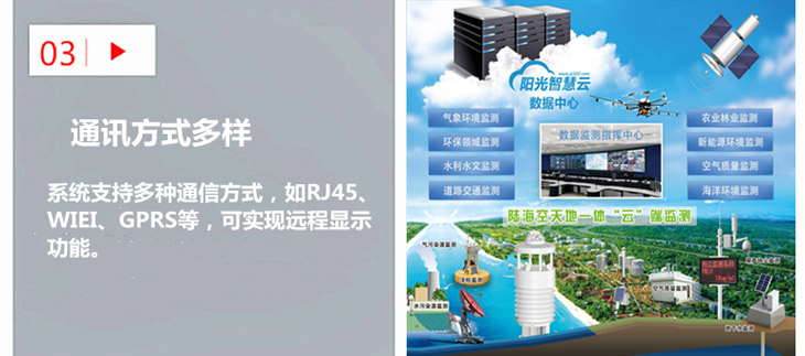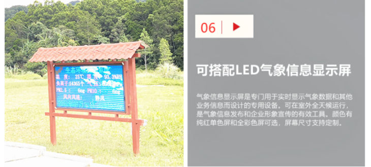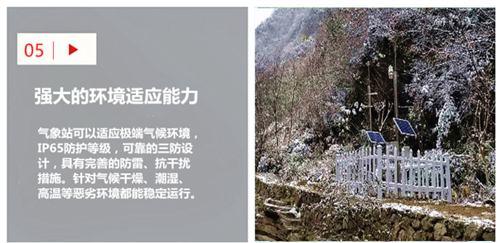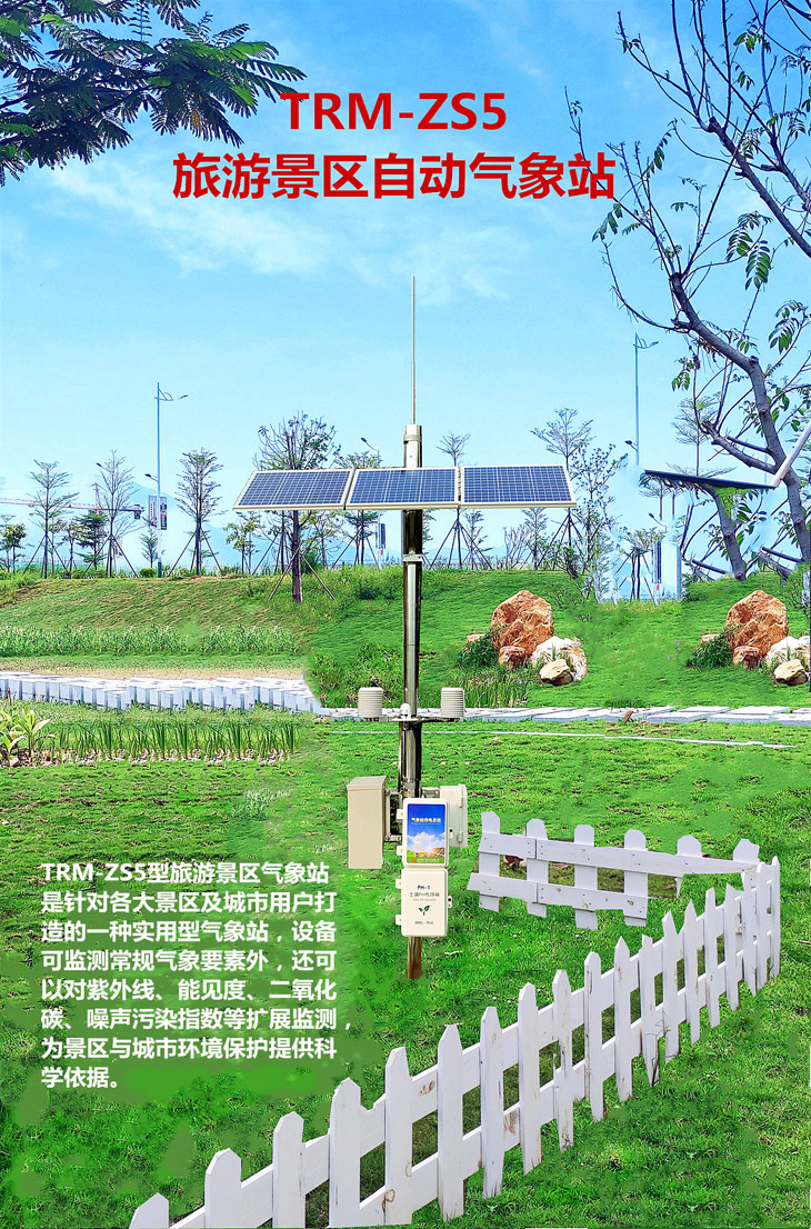 TRM—ZS5型旅游景區自動氣象站是針對各大景區及城市用戶的一種實用型自動氣象站,它除可測量常規氣象要素如風向、風速、溫度、濕度、氣壓、雨量外,還可對紫外線、特零地溫(即零厘米土面、水泥面、瀝青面、草坪)的觀測,為景區及城市環境保護提供科學依據。