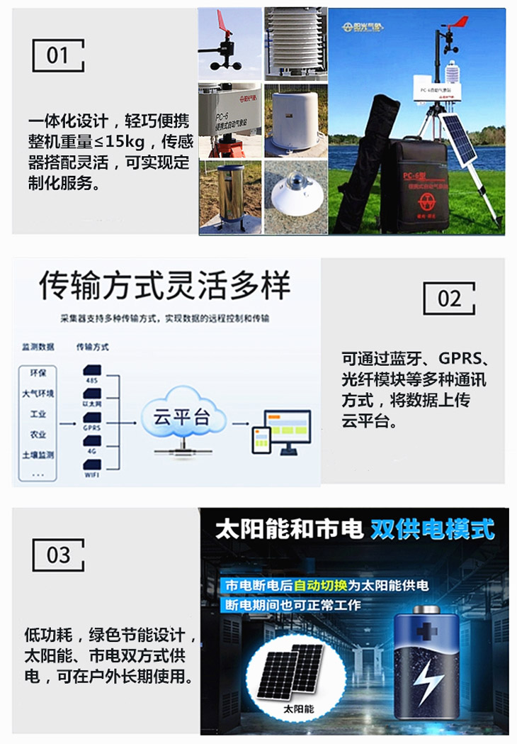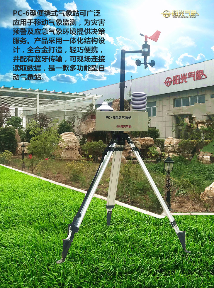 PC-6型便攜式陽光氣象站是非常便捷的氣象觀測站,核心監測部分整體重量不超過5KG,高度集成,體積小巧,攜帶方便,是一款性價比突出的小型自動氣象站。