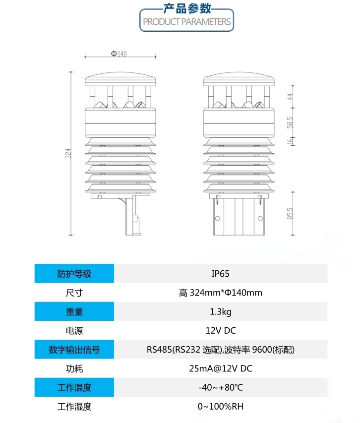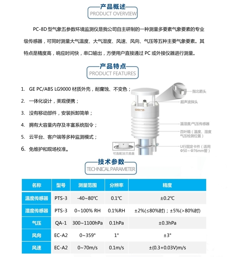 PC-8D型氣象五參數(shù)環(huán)境監(jiān)測(cè)儀是我公司自主研制的一種測(cè)量多要素氣象要素的傳感器,可同時(shí)測(cè)量大氣溫度、大氣濕度、風(fēng)速、風(fēng)向、氣壓等五種主要?dú)庀笠亍F涮攸c(diǎn)是精度高,響應(yīng)時(shí)間快,串口輸出,方便用戶直接通過PC或外接儀器進(jìn)行測(cè)量。