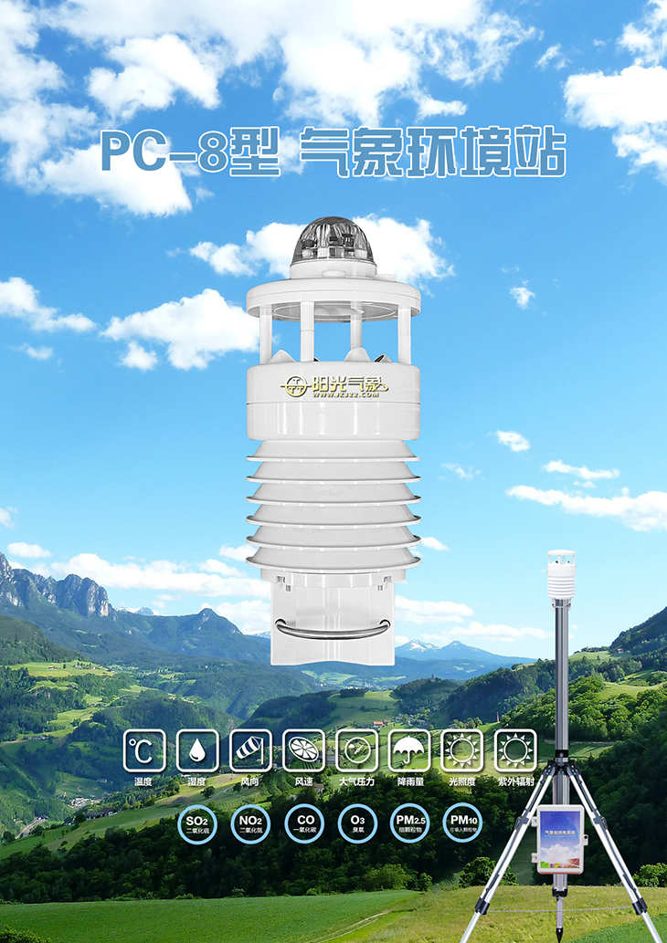 PC-8型氣象環境站是錦州陽光氣象結合國外先進技術,自主研發的高端氣象環境儀器,是利用超聲波探頭測量風速風向,內置各種氣象傳感器,無任何移動部件的一個結構緊湊的新型儀器。其具有精度高,無機械磨損,故障率低,二維測風,體積小,完全替代傳統氣象站。