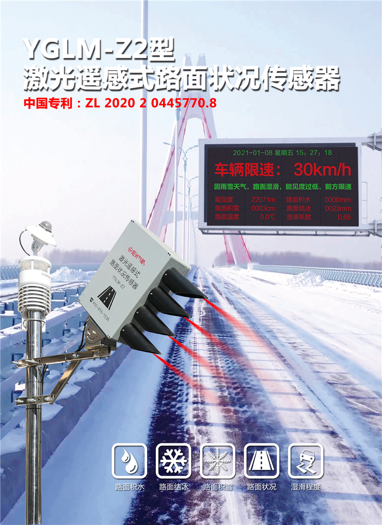YGLM-Z2型激光遙感式路面狀況傳感器采用多光譜測量技術,傳感器不需要植入路面內(nèi)即可準確地檢測出道路表面結(jié)冰、積雪、水膜的厚度及濕滑程度、路面溫度等要素,監(jiān)測儀集成了微型處理器來識別道路或機場跑道的路面狀態(tài)。