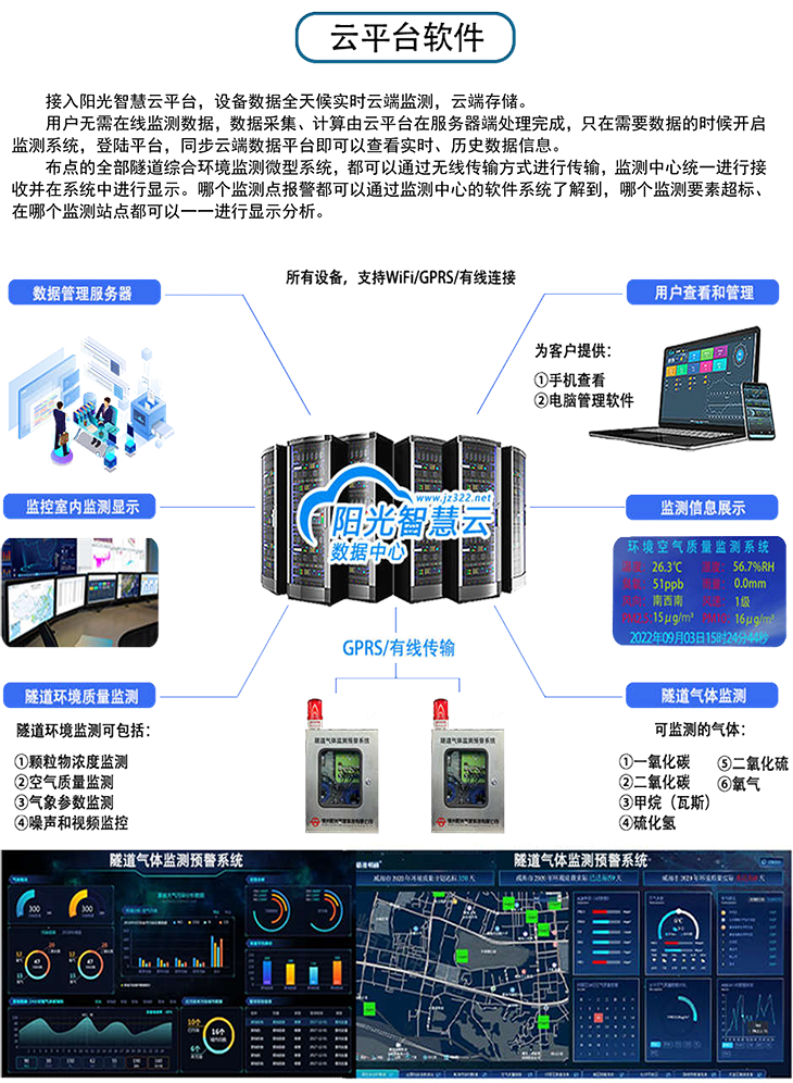 隨著隧道開挖的深入,一些隧道會出現(xiàn)有毒有害氣體和粉塵,如甲烷、一氧化碳、硫化氫、PM10等氣體和顆粒物。為加強隧道施工人員的安全管理,防止在隧道施工工程中氣體和粉塵超限帶來危險,確保人員、機具和工程安全,做好監(jiān)測預(yù)防工作,部署隧道氣體監(jiān)測系統(tǒng)是非常有必要的。本系統(tǒng)以《隧道安全規(guī)程》、《公路隧道施工規(guī)范》以及《作業(yè)場所空氣中粉塵濃度測定方法》為主要依據(jù),并根據(jù)上述“規(guī)程、規(guī)范”要求進行有毒有害氣體監(jiān)測、預(yù)防和控制。根據(jù)有害氣體的含量高低、濃度大小,采取相應(yīng)的技術(shù)措施,根據(jù)隧道有毒有害氣體的實際情況,將甲烷(瓦斯)(CH4)、一氧化碳(CO)、二氧化碳(CO2)、氧氣(O2)、粉塵(PM2.5+PM10)作為主要監(jiān)測對象,把一些含量低、濃度小的有害氣體作為輔助監(jiān)控對象。隧道氣體監(jiān)測預(yù)警系統(tǒng)通過傳感器采集施工現(xiàn)場狀況,經(jīng)過數(shù)據(jù)處理分析傳入后臺,可顯示現(xiàn)場環(huán)境監(jiān)測指數(shù),對于超過臨界值的數(shù)據(jù)進行報警。此外,借助視頻監(jiān)控對隧道內(nèi)情況進行監(jiān)控,防止人員進入。