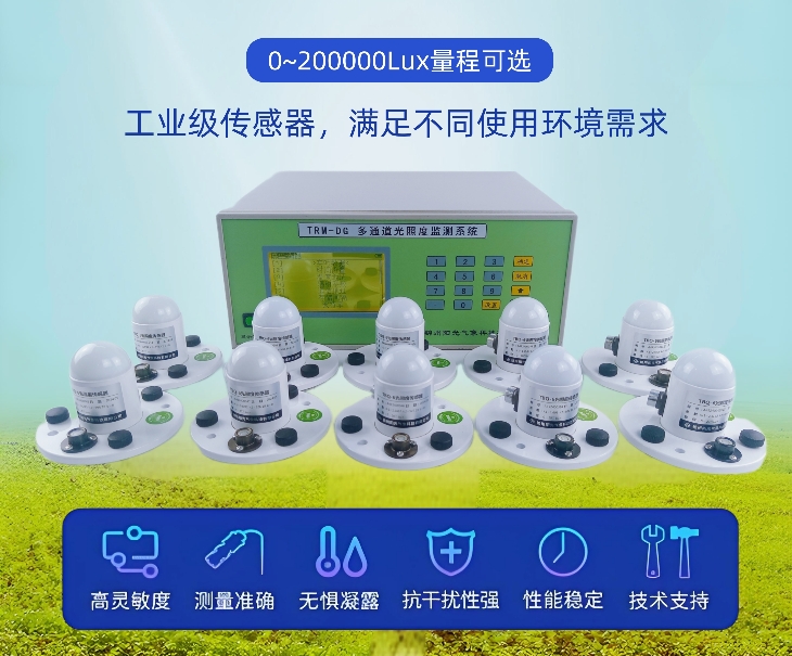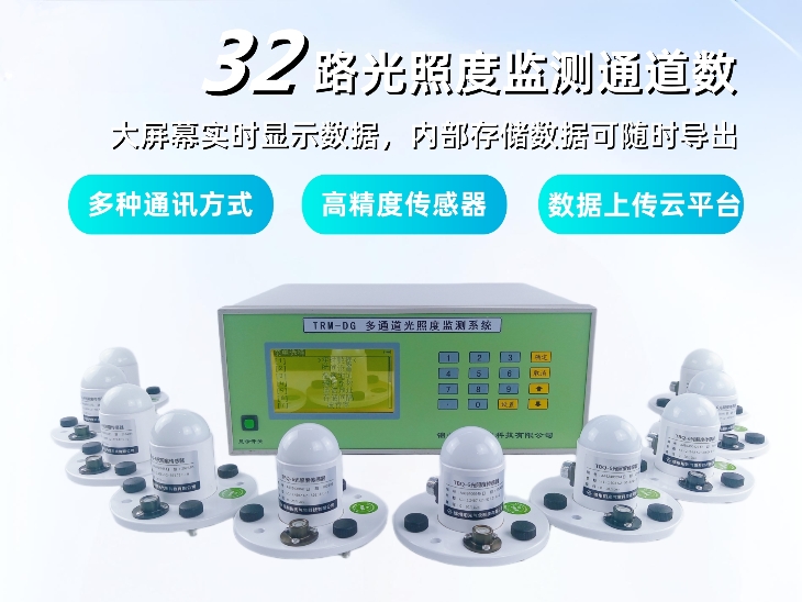TRM-DG1型多通道光照度監(jiān)測系統(tǒng)是一種用于測量光照強度的專業(yè)儀器,能夠幫助我們了解和掌控各種環(huán)境中的光照條件。多通道光照度監(jiān)測系統(tǒng)由多臺光照度傳感器和數(shù)據(jù)記錄儀組成。光照度傳感器采用對弱光也有較高靈敏度的硅蘭光伏探測器作為感光元件,并將捕捉到的光信號轉換為電信號,電信號最終被多通道光照度監(jiān)測記錄儀放大、優(yōu)化后轉換為光照度數(shù)據(jù),記錄儀最多可連接32個通道,實現(xiàn)多個不同位置的光照度同時監(jiān)測,非常適合于需要全面了解光照分布的場景。