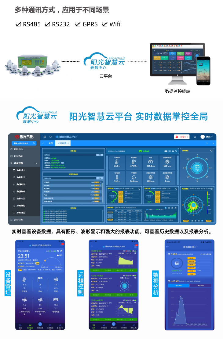 12. 數(shù)據(jù)可上傳我司智慧云平臺,支持 PC、手機 APP、小程序等多端軟件對設備進行管理,可視化數(shù)據(jù)大屏視圖,動態(tài)顯示數(shù)據(jù)、包含設備在地圖上的分布、告警日志、統(tǒng)計數(shù)據(jù)等。