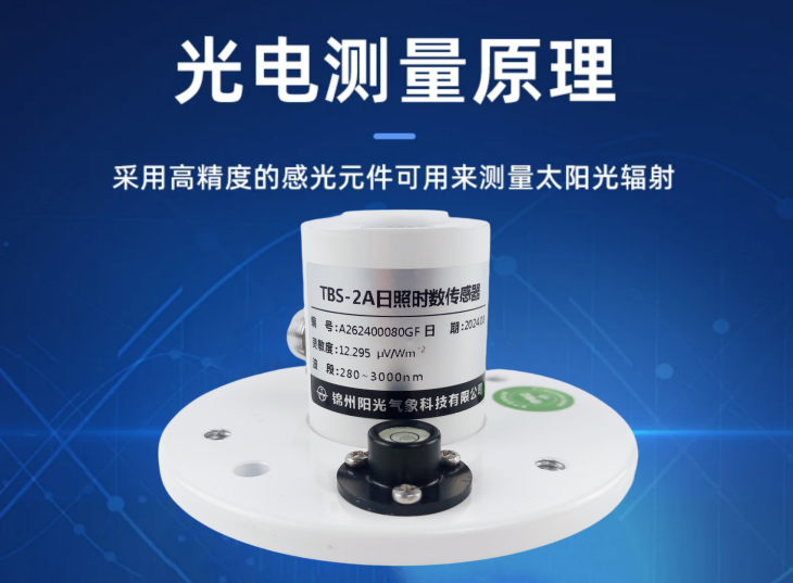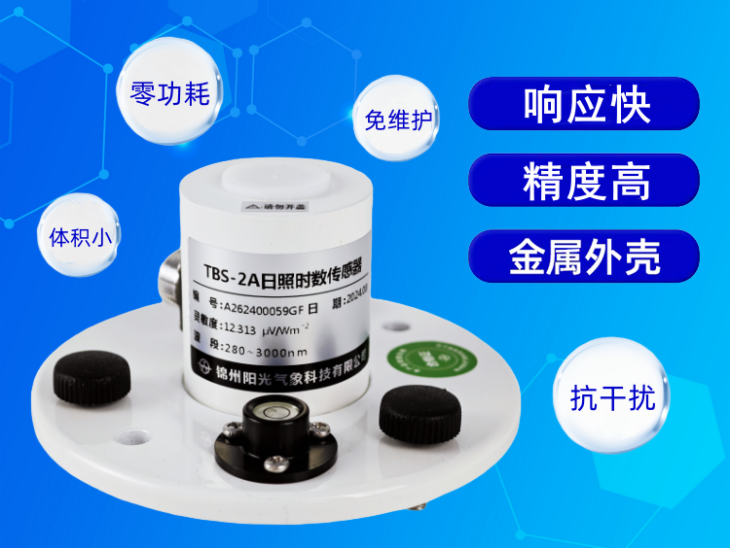 日照時數是指太陽每天在垂直于太陽光線平面上的輻射強度超過或等于120W/m2時間段的總和,以小時為單位,取一位小數。日照時數也稱實照時數。TBS-2A日照時數傳感器用于連續測量太陽輻射量,通過計算統計得到日照時間,儀器本身沒有移動部件、不需供電、免于維護,能夠勝任野外的長期監測使用。