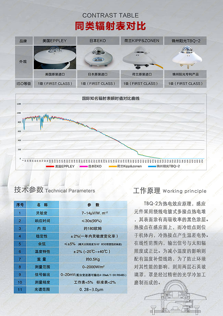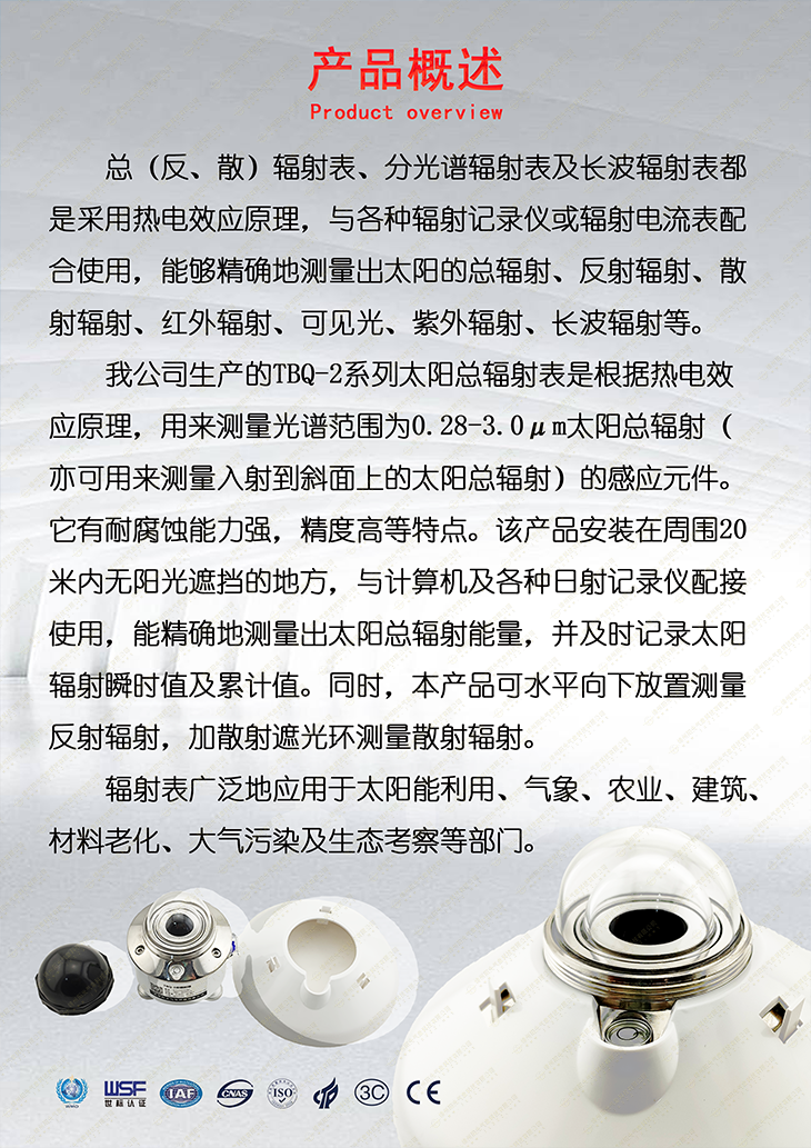 我公司生產的TBQ-2太陽總輻射表是根據熱電效應原理,用來測量光譜范圍為0.28-3.0μm太陽總輻射(亦可用來測量入射到斜面上的太陽總輻射)的感應元件。它有耐腐蝕能力強,精度高等特點。