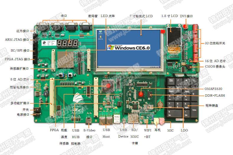 ★具有WIFI、Bluetooth、UART、USB、SD卡、以太網、DVI輸出、標準S-Video接口、TV-OUT輸出、LED數碼管、紅外接口、AC97接口、重力感應接口、攝像頭等主流音視頻部件。