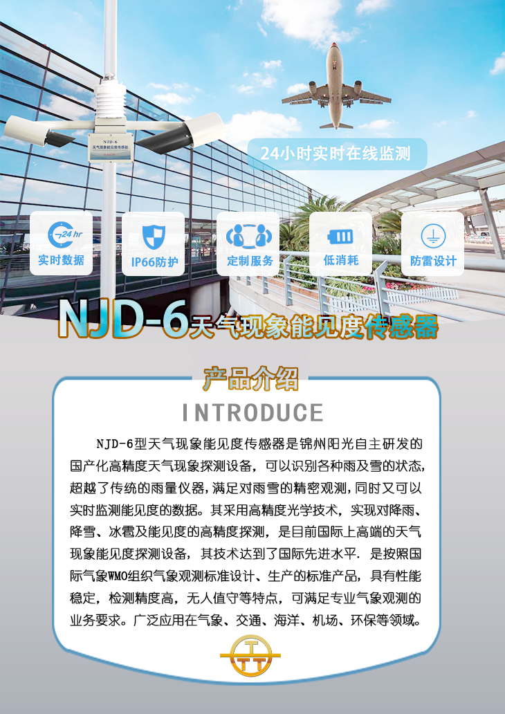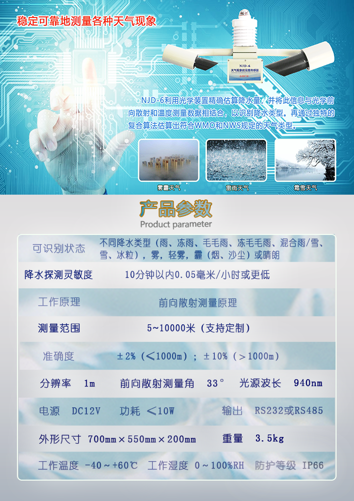 NJD-6型天氣現(xiàn)象能見度傳感器是錦州陽光自主研發(fā)的國產(chǎn)化高精度天氣現(xiàn)象探測設(shè)備,可以識別各種雨及雪的狀態(tài),超越了傳統(tǒng)的雨量儀器,滿足對雨雪的精密觀測,同時又可以實時監(jiān)測能見度的數(shù)據(jù)。