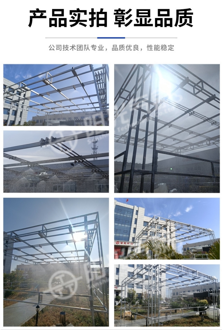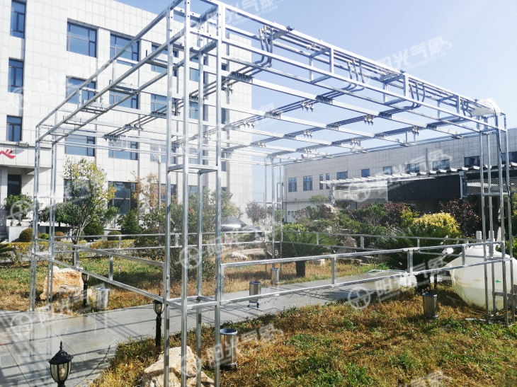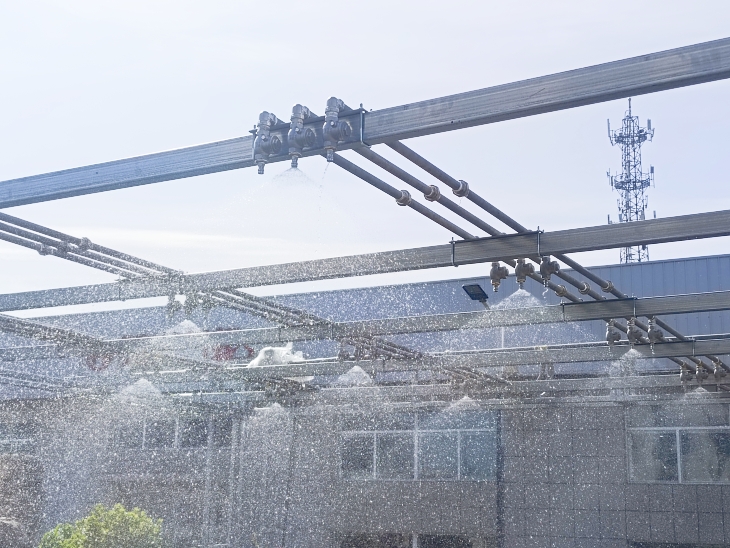 噴霧單元由供水管路、直管段、噴嘴、支架等組成,噴嘴采用專業模擬雨滴噴頭——旋轉下噴式噴嘴,不銹鋼材質,噴嘴和直管段集成在一起,噴霧支架為不銹鋼方管結構,用來架設供水管路和噴嘴。噴霧單元設計噴霧量為200~1000L/H,噴霧壓力0.5~3Bar,噴霧高度和覆蓋面積可按用戶需求進行定制。